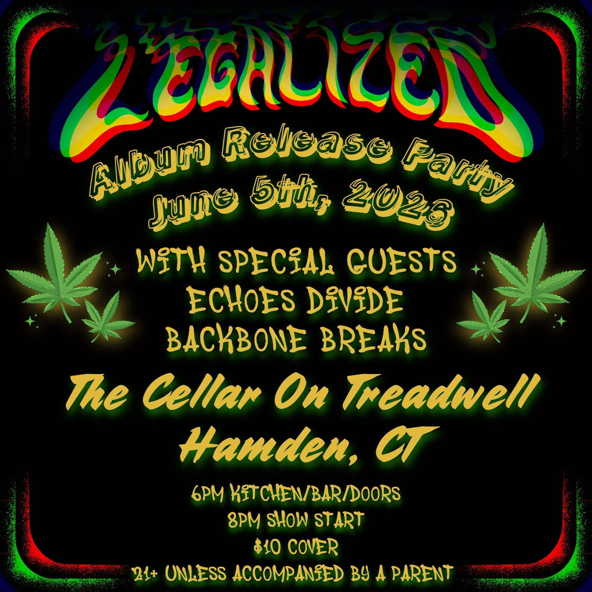Legalized Album Release Party Friday, June 5, 2026 6:00 PM 11:59 PM Google Calendar ICS Legalized Album Release Party w/s/g Echoes Divide & Backbone BreaksFriday, June 5Doors/Kitchen/Bar: 6 PMMusic: 8 PM$10 at the door21+ unless accompanied by a parent or legal guardian